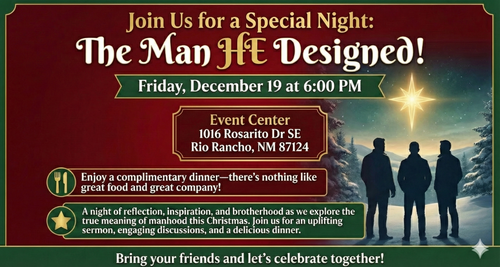 The night will include praise and worship, great food with a holiday twist, and an encouraging message titled “The Man That He Designed.”